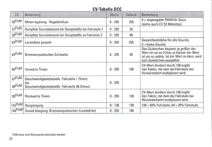 DCC CV Tabelle für Märklin Nachrüstdecoder