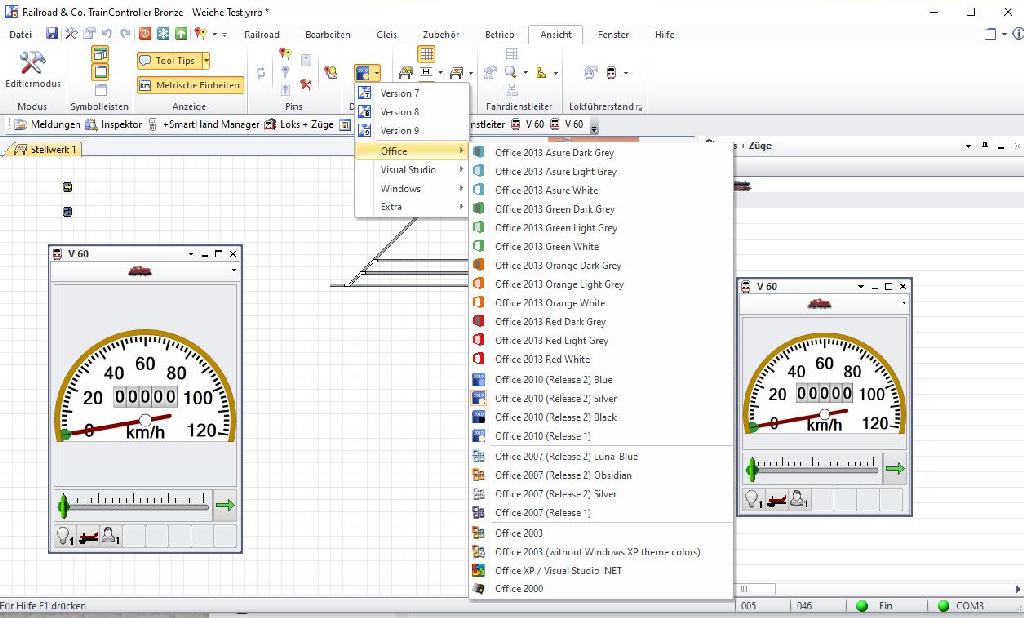 Das Programm TrainController Bronze präsentiert sich in gewohntem Windows Look. Man kann zwischen 2 Menüleisten Ansichten wählen und es sind hier verschiedenste „Windows-Views“ einstellbar – z,B verschiedene Windows oder Office Versionen/Views. Die Symbolleisten können wie in Windows üblich selbst gestaltet, positioniert und ein bzw. ausgeblendet werden.