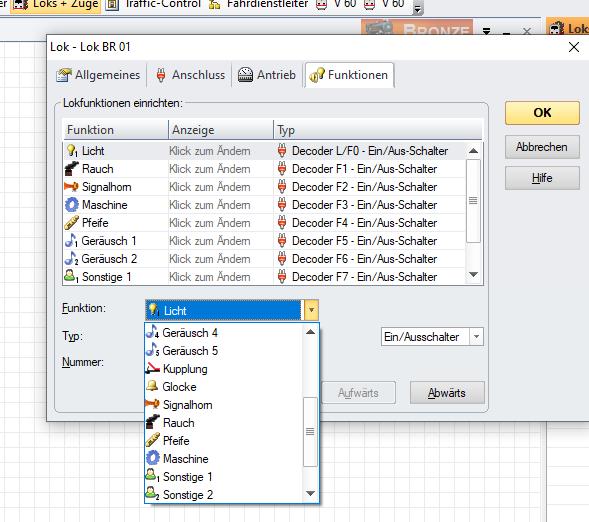Unter „Funktionen“ kann man dann der Lok die Funktionen zuordnen. In der Bronze Version ist eine gescheite Zuordnung nicht möglich, dafür stehen zu wenige und zu viele gleiche Icons zu Verfügung. Erst ab der viel teuren Silver Version kann man hier gescheit arbeiten. Dies ist ein großes Mango, da eine gescheite Loksteuerung nur mit den für die Lok Verfügbaren Funktionen Sinn macht. Ein Pluspunkt ist aber die „Verschiebe Funktion“. Damit können die Funktionen in ihrer Reihenfolge (unabhängig von der F-Position) in der Reihenfolge geändert werden.