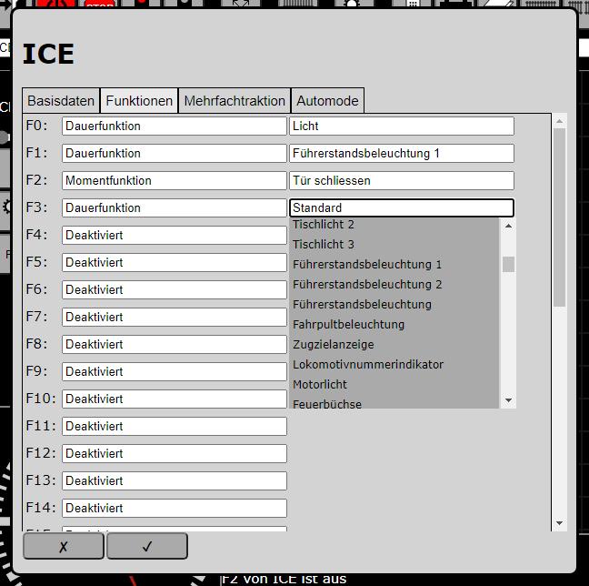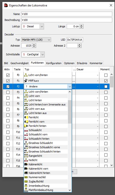 Ansonsten trägt man nach Auswahl des Decoder Typs die Adresse ein, Name, Loktyp und evtl. die Beschreibung und Länge in cm. Damit wäre die Lok schon angelegt. Über die Registrierkarten können dann noch weitere Einstellungen vorgenommen haben. Den Fahrstufen z.B. eine Geschwindigkeit zuordnen oder die Funktionen (die es in großer Anzahl gibt) zuordnen, usw, usw.