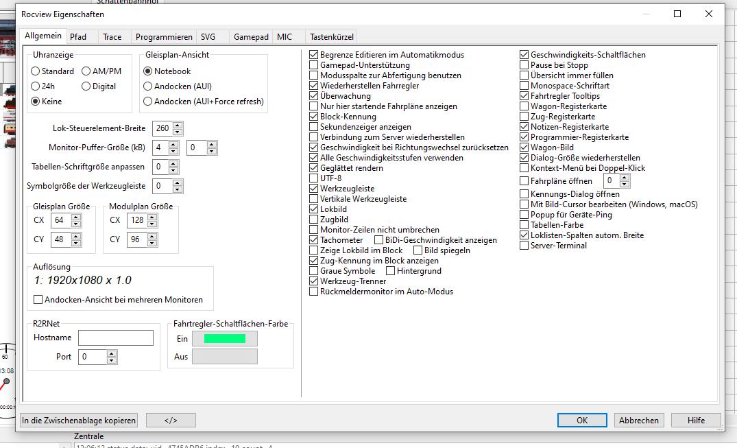 Schon in der Registrierkarte Allgemein sieht man die Fülle an Einstellungsmöglichkeiten. Kein anders der hier vorgestellten Programme bietet diese vielzahl an Möglichkeiten. Das meiste ist „nice to have“ aber einiges zeigt schon wie umfangreich dieses Programm gestaltet ist und arbeitet. Lokbild – selbst erstellte Funktionsicons – Mehrfachtraktion – Geschwindigkeitseinstellung – Verzögerungen bis hin zu Geschwindigkeitsänderungen in gewissen Blöcken ist alles vorhanden.
