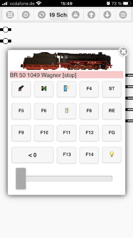 Man kann verschiedene Gleispläne (sogenannte Layer) anlegen und über ein Pulldown Menue anwählen. Das Gleiche gilt für die entsprechende Lok. Es ist wie bei iTrain immer nur eine Lok aktiv sichtbar und kann gesteuert werden. Es gibt hier nur einen Schieberegler (ohne Tacho Anzeige), dafür 4 abgestufte Geschwindigkeitstasten und eine „0“ Taste.