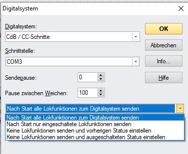 Über den Menü Punkt Railroad -> Digital Systeme einrichten… kann man über den Button „Hinzufügen“ sein Digitalsystem aus einer Liste auswählen. Je nach System ist der USB Port oder eine IP Adresse zur Verbindung anzugeben. Zusätzlich kann eine Pause zwischen den gesendeten Befehlen und die Pause zwischen Weichenschaltungen eingestellt werden. Und wie sich das System beim Start verhalten soll. Bei der Bronze Version kann noch ein zweites System hinzugefügt werden. Dabei kann das zweite System nur zur Überwachung von Rückmeldekontakten verwendet werden. (in der Top Version können bis zu 12 Systeme angeschlossen werden)