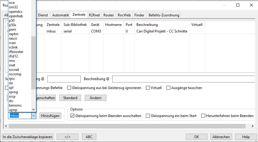 Wie man sieht, sind hier wieder von allen Programmen die Einstellungen am vielfältigsten und individuellsten. Hier wird es in einigen Fällen von Nöten sein, das Handbuch heranzuziehen, denn viele Verbindungen sind gruppiert. Ich hatte meine „CC_Schnitte“ auch nicht unter dem Verbindungstyp „mbus“ vermutet. Dafür sind aber auch die Verbindungstypen und Systeme fast unbegrenzt… Natürlich sind mehrere Zentralen möglich.