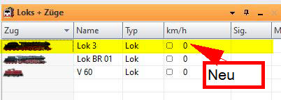 Über Das Lok Symbol öffnet sich der Lokomotiven Dialog. Hier kann man mit Bearbeiten Lokomotiven ändern, oder über den Button Neu eine neue Lok anlegen.