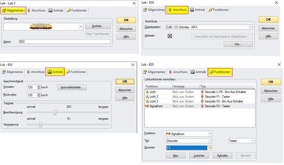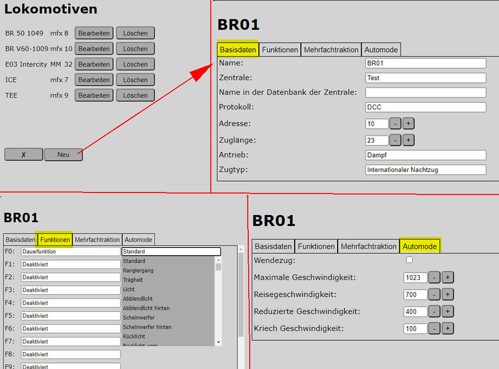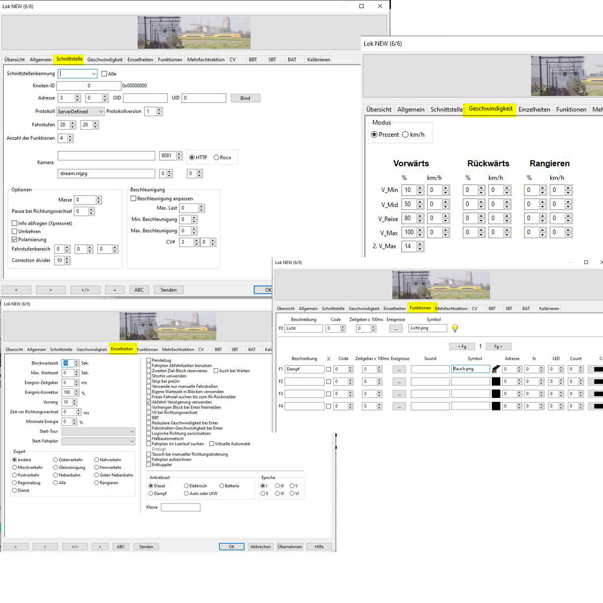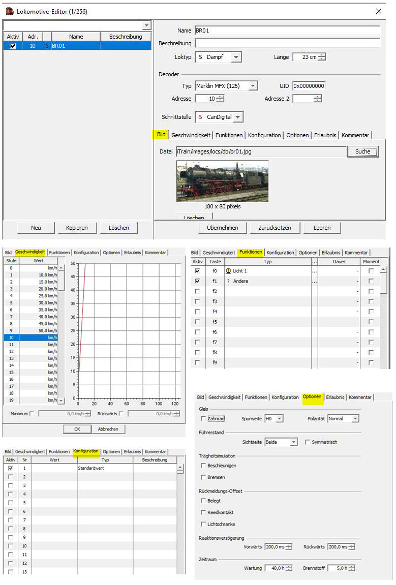 Unter Basisdaten wird der Name, die Zentrale, das Protokoll (Decoderyp) die Adresse usw. eingetragen. In der Registrierkarte Funktionen werden die Funktionen zugeordnet – auch hier sind genügend Funktionen und Symbole vorhanden. RailControl unterstützt die Mehrfachtraktion. Dabei wird vorausgesetzt, dass die Lokomotiven bei gleicher Fahrstufe gleich schnell fahren. Dies kann in der Karte Mehrfachtraktion eingestellt werden. Und zuletzt kann man noch auf der Registrierkarte Automode die Geschwindigkeit sowie die Verzögerungswerte einstellen. Ein Lokbild ist in RailControl nicht vorgesehen.