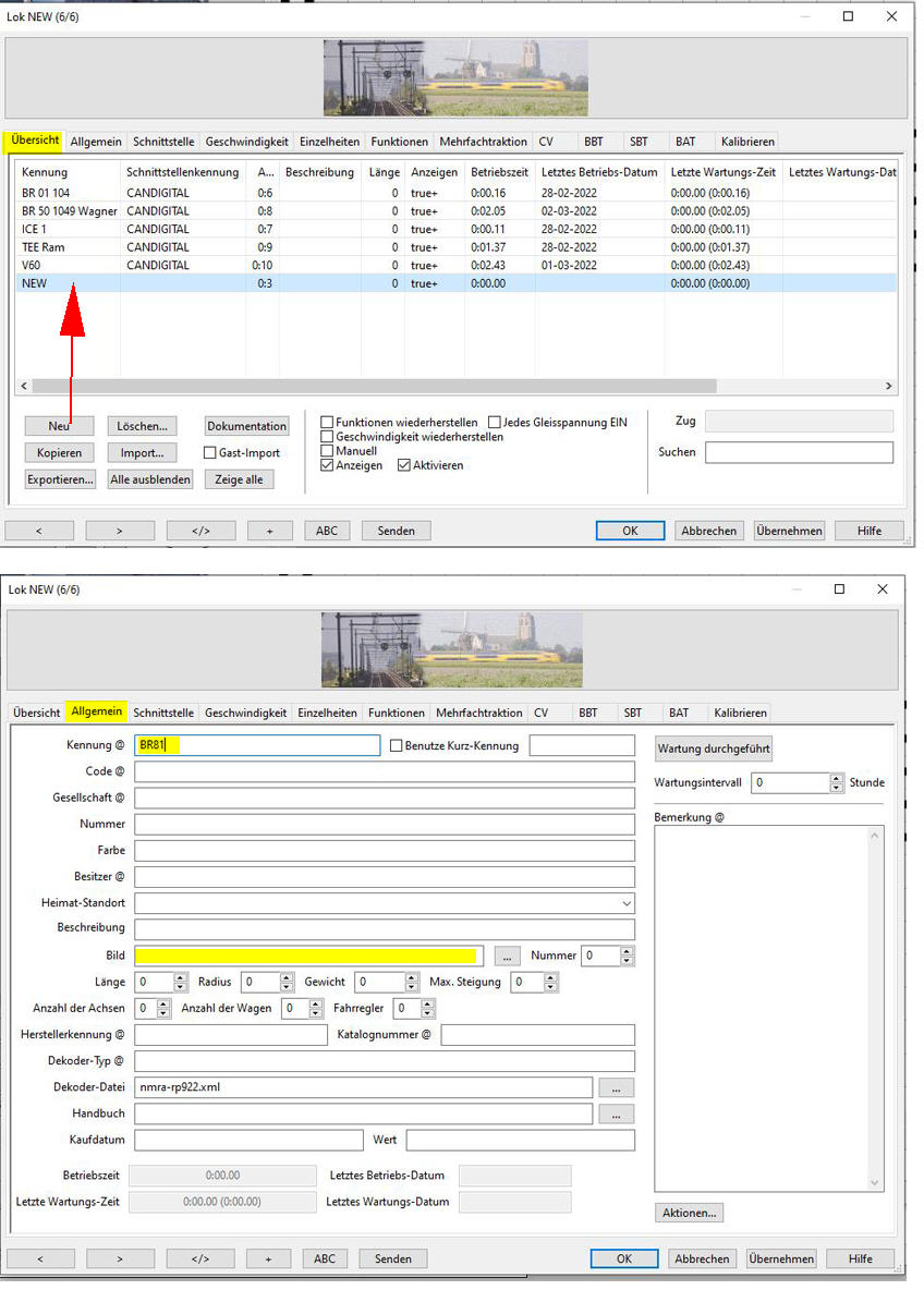 Über den Menü Punkt Tabellen -> Lokomotiven gelangt man in die Lokomotiv Übersicht. Über den Button Neu wird eine neue „Lok zeile“ angelegt. Die hinterlegte Lokzeile kann dann über die Registrierkarten bearbeitet werden.