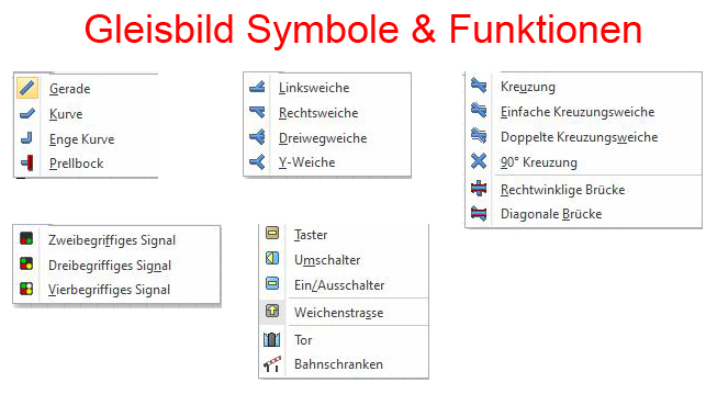 Für das Gleisbild zu zeichnen stehen verschiedene Gleisarten und Zubehör zur Verfügung. Texte können natürlich auch eingefügt werden. Und gerade Gleise können mit dem Zeichenwerkzeug in einem schritt gezeichnet werden.