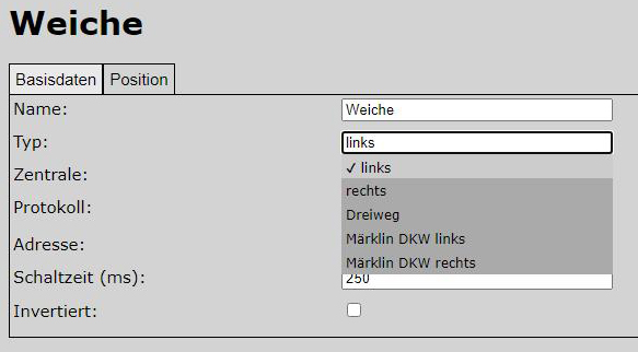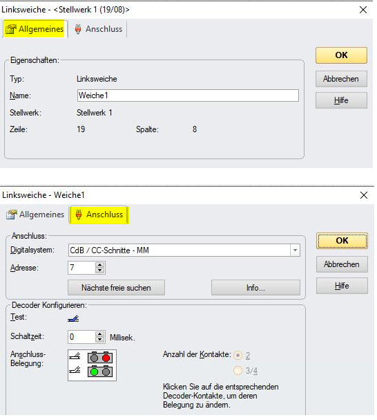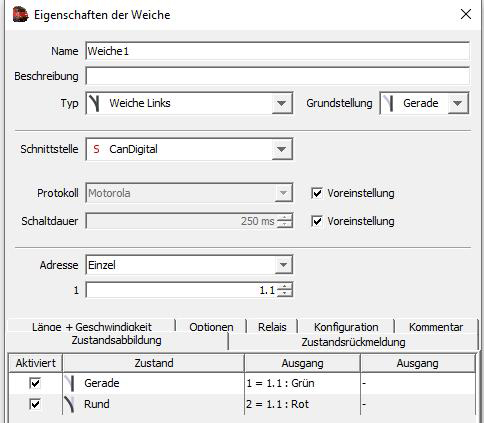 Über den Menü Punkt Tabellen -> Weichen kommt man in die Weichen Übersicht, kann dort die Weiche auswählen und über die Registrierkarten konfigurieren. Alternativ geht auch ein Rechtsklick auf die betreffende Weiche im Gleisplan und dann den Menüpunkt Eigenschaften wählen.