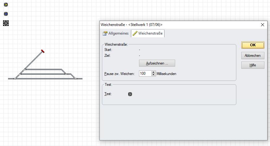 Letztendlich wählt man den Punkt Weichenstraße im Menüpunkt Werkzeuge -> Zubehör und setzt einen Weichenstraßenschalter auf das Gleisbild. Ein Doppelklick auf das Symbol öffnen sich die Einstellungen.