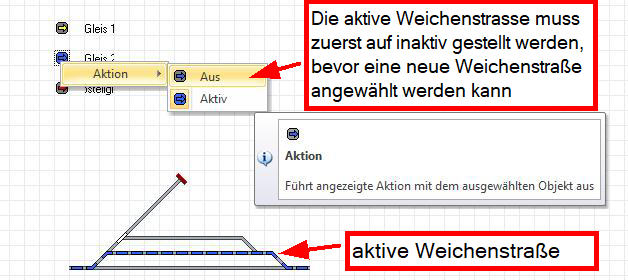 Leider hat das ganze einen kleinen Wehrmutstropfen. Bevor man eine Weichenstraße anwählen kann, muss man zuerst die vorher angewählte Straße anklicken und sie auf inaktiv setzten. Erst jetzt kann man die neue Weichenstraße anwählen. Etwas umständlich – aber hier spielt der „Automatik-Gedanke“ das immer nur Eines gehen darf der manuellen Steuerung entgegen.