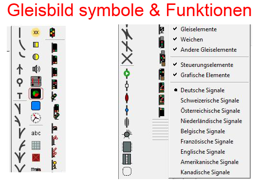 Das Gleisbild in ITrain wird im Gleisbild Editor gezeichnet. Hierfür stehen ebenfalls eine Vielzahl an Schienen, Weichen, Zubehör etc. zur Verfügung. Bei den Signalen kann man sogar Länderspezifisch unterscheiden.