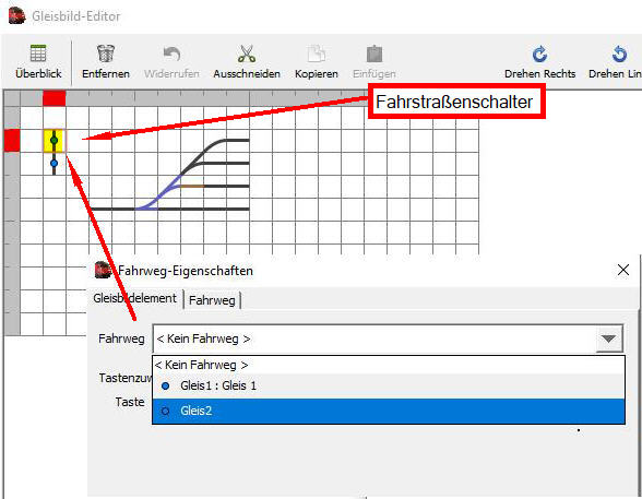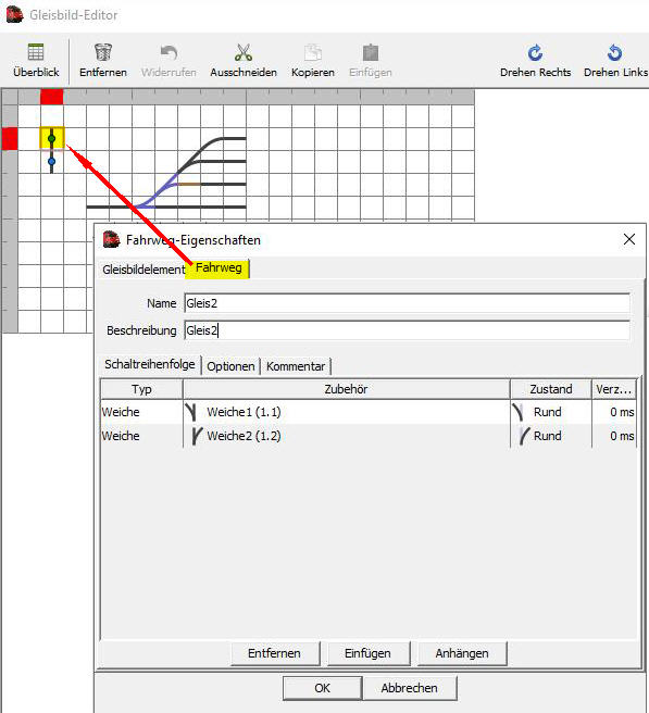 Über den Menüpunkt Bearbeiten -> Fahrwege werden die entsprechenden Fahrwege generiert. Her werden die Weichen nacheinander angegeben die geschaltet werden müssen, um das entsprechende Gleis zu erreichen. Im Gleisbild können dann „Fahrwerksschalter“ platziert und betextet werden. Dem Schalter wird dann je ein Fahrweg zugeordnet. Fertig…..