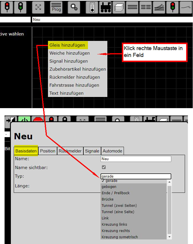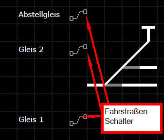 An der Stelle, wo der Fahrstraßenschalter platziert werden soll mit der rechten Maustaste auf das entsprechende Kästchen im Layer klicken, und Fahrstraße in der Übersicht auswählen.