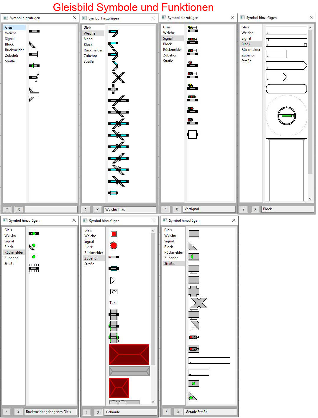 Das Gleisbild wird auf dem aktiven Gleisplan (es sind mehrere Gleispläne möglich). Über den Menü Punkt Gleisplan –> Plan bearbeiten wird ein Symbol Panel angezeigt. Hier kann wie auch bei den anderen Programmen die entsprechenden Symbole, bzw. Schienen, Weichen etc. auswählen. Man zieht einfach das gewünschte Symbol mit gedrückter linker Maustaste auf das entsprechende Rasterfeld.