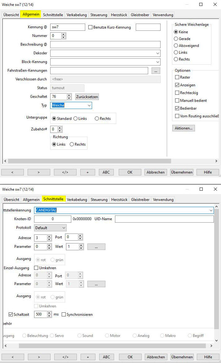 Die Weichen müssen dann ebenfalls eingestellt werden, was mit klick auf die Weiche mit der rechten Maustaste und Auswahl „Eigenschaften“ erreicht wird. Neben den Standardeinstellungen wie Name, Zentrale etc. sind über die Registrierkarten noch eine vielzahl von Einstellungen optional möglich.