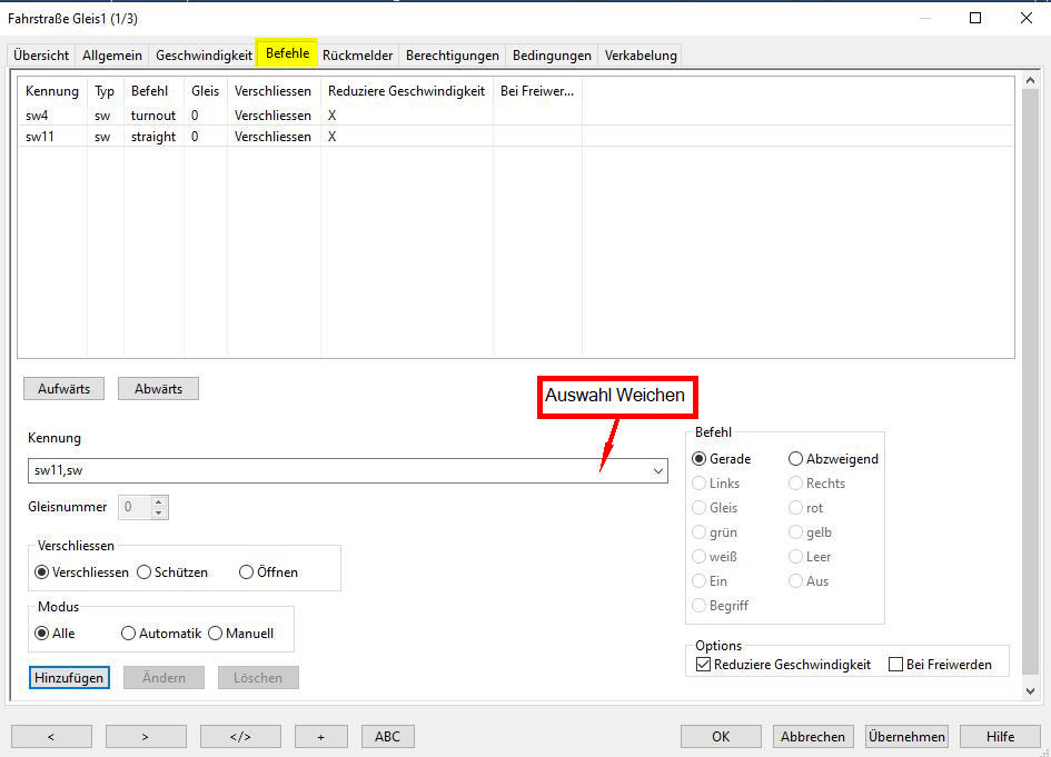 Über Hinzufügen werden die Weichen für die Fahrstraße mit den jeweiligen Schaltzuständen hinzugefügt. Über das Pulldown Menü Kennung wählt man die entsprechende Weiche aus, gibt die Richtung an und drückt dann die Taste hinzufügen. Die Weichen können zwar später in ihrer Reihenfolge geändert werden, es können aber keine Änderungen mehr an den Eingaben vorgenommen werden. Hat man aus versehen die verkehrte Richtung angegeben, muss man die Zeile wieder löschen und neu anlegen – kann sie aber dann mit Aufwärts und Abwärts wieder an die richtige Position bringen.