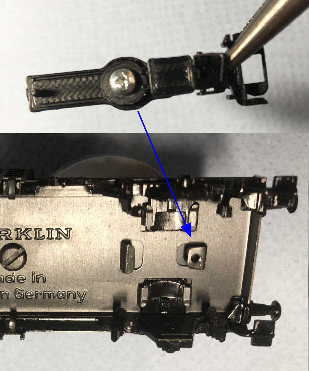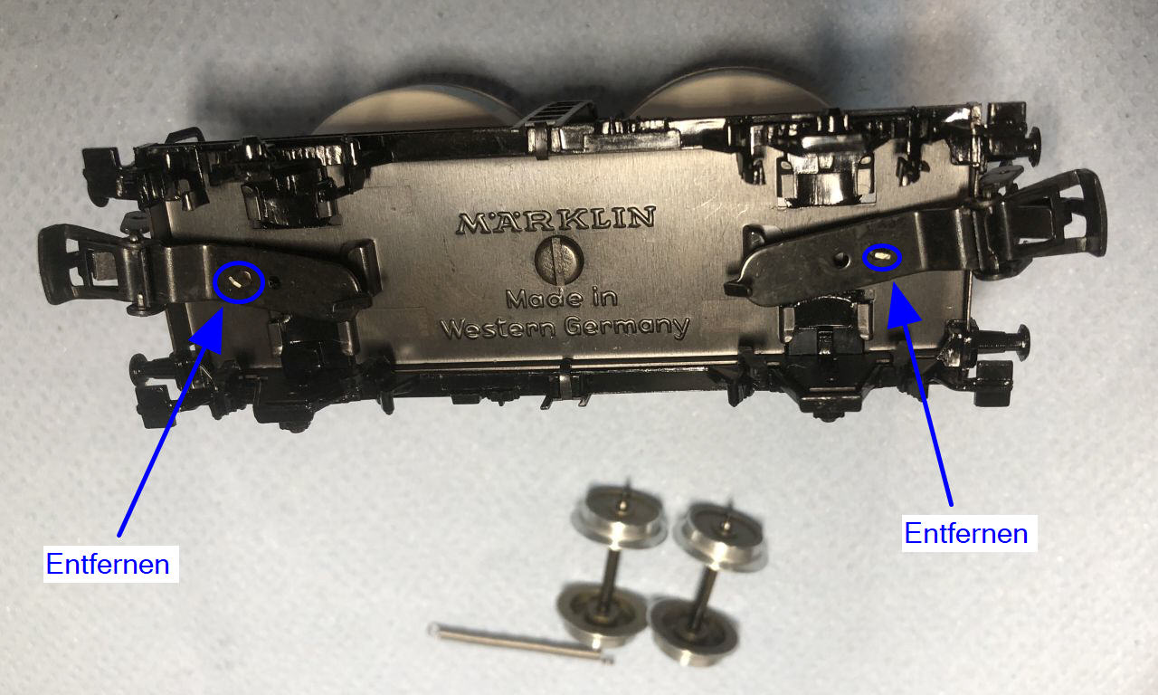 Dieser Umbau beschreibt den Umbau älterer Waggons mit angenieteter Relex Kupplung (wie im Bild abgebildet) mit einer aus dem 3D Drucker stammenden „angeschraubter NEM Deichsel" für die Aufnahme von Märklin Kurzkupplungen.